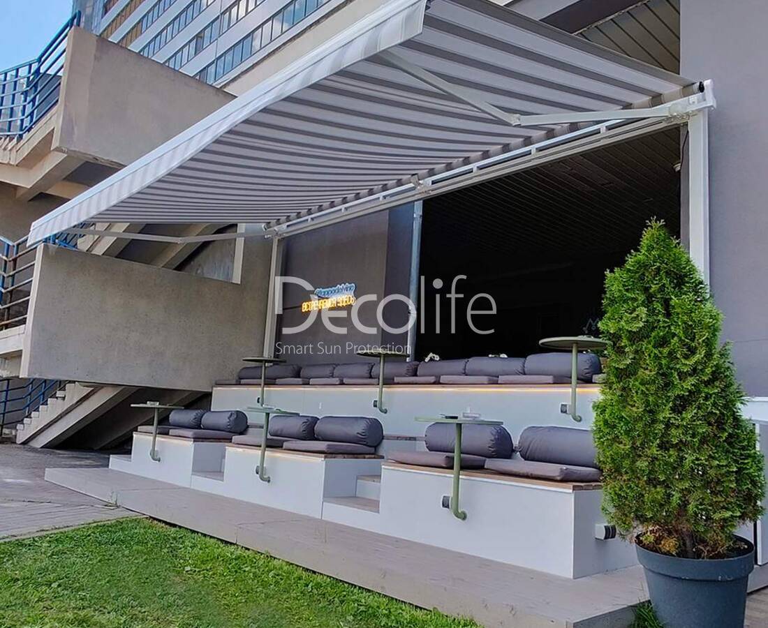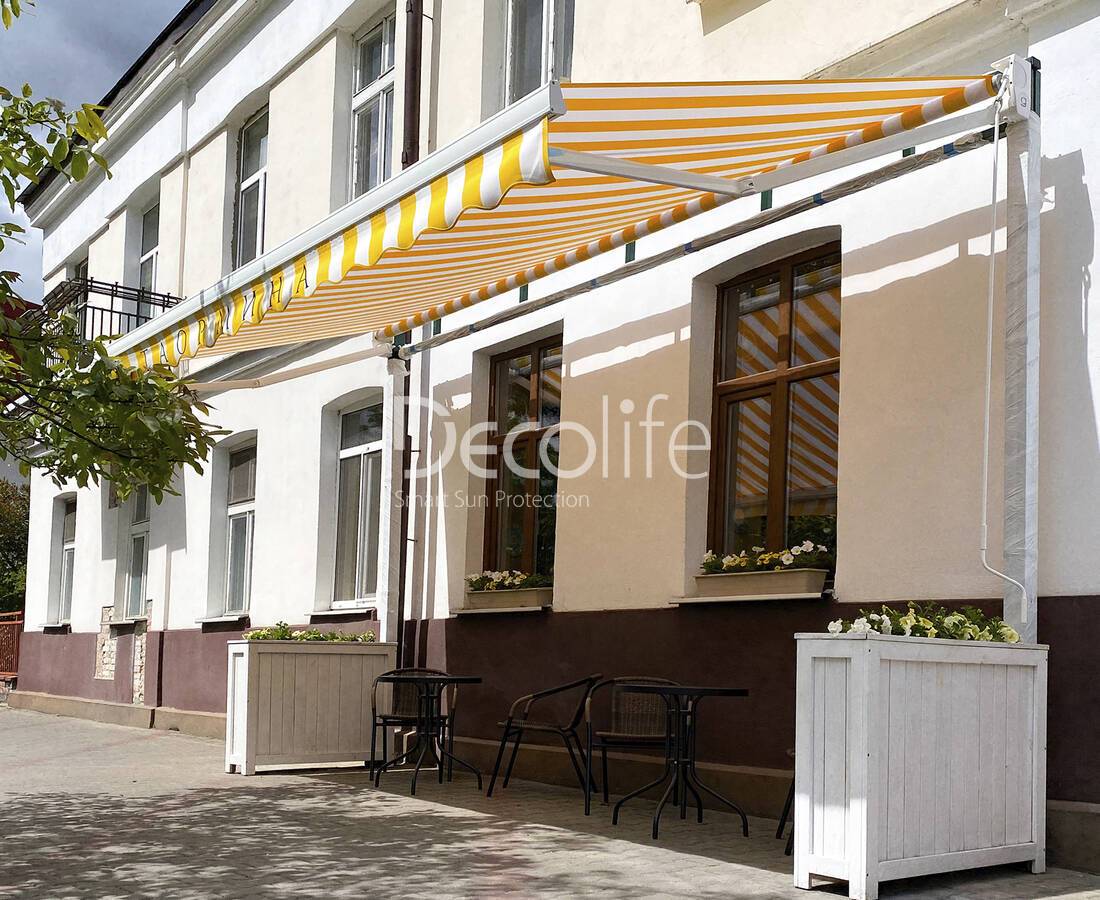 Маркиза открытая Decolife G90, реализован партнером ООО "Европейские Солнцезащитные Системы" - кофейня "Сладкий домик"